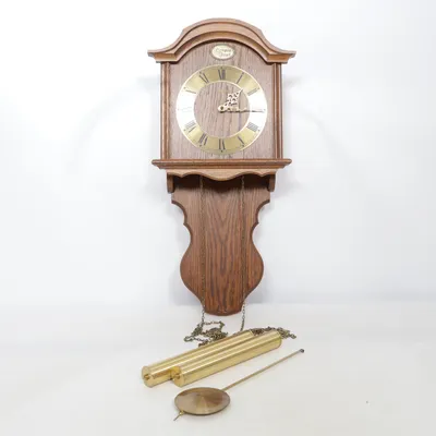 Wall clock, Kettenzugwerk, 1/2 Stundenschlagwerk, Eiche furniert, Messing Zahlenreif